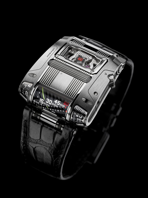 URWERK UR-111C IRON 型號:UR-111C IRON 機芯 自動上鍊機芯動力儲存48小時 功能 跳躍時間,逆行線性分鐘,數字分鐘,數字秒防水30米,限量25只 錶殼、錶盤和指針 42 x 46 mm精鋼錶殼 錶帶和錶扣 皮革錶帶 分享到: