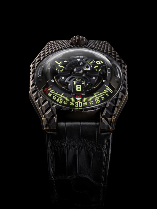 URWERK UR-100V T-Rex 型號: 機芯 UR 12.02自動上鍊機芯,渦輪自動系統調節 功能 衛星小時及分鐘,地球赤道自轉 20 分鐘的距離,地球公轉 20 分鐘 的距離 錶殼、錶盤和指針 雕花錶殼為青铜錶殼,底蓋為黑色PVD鈦金屬。 錶帶和錶扣 分享到: